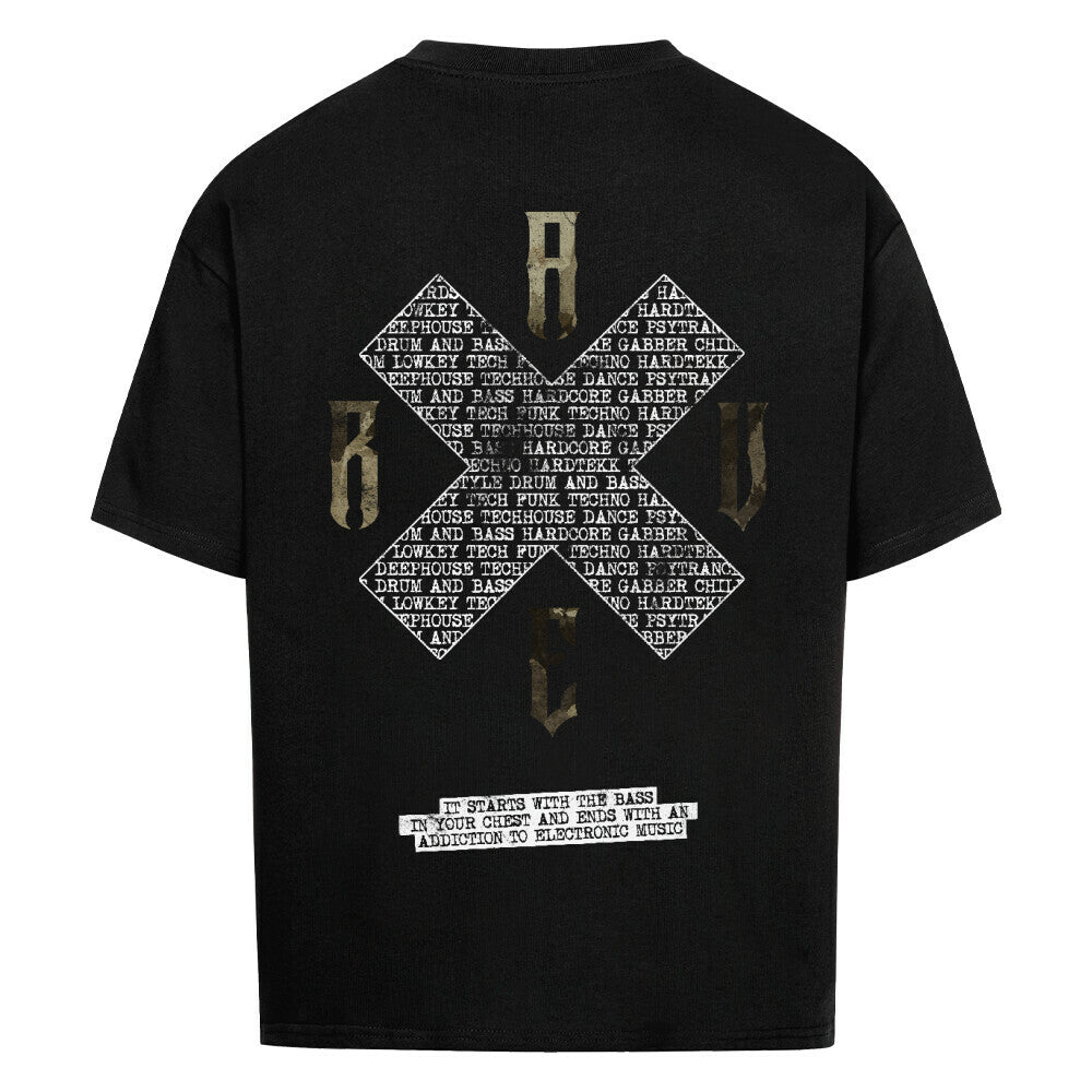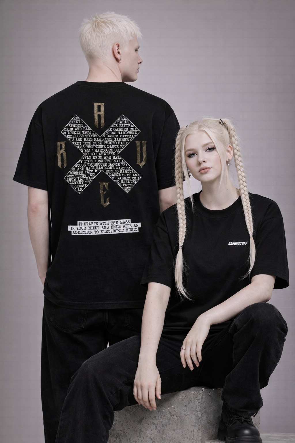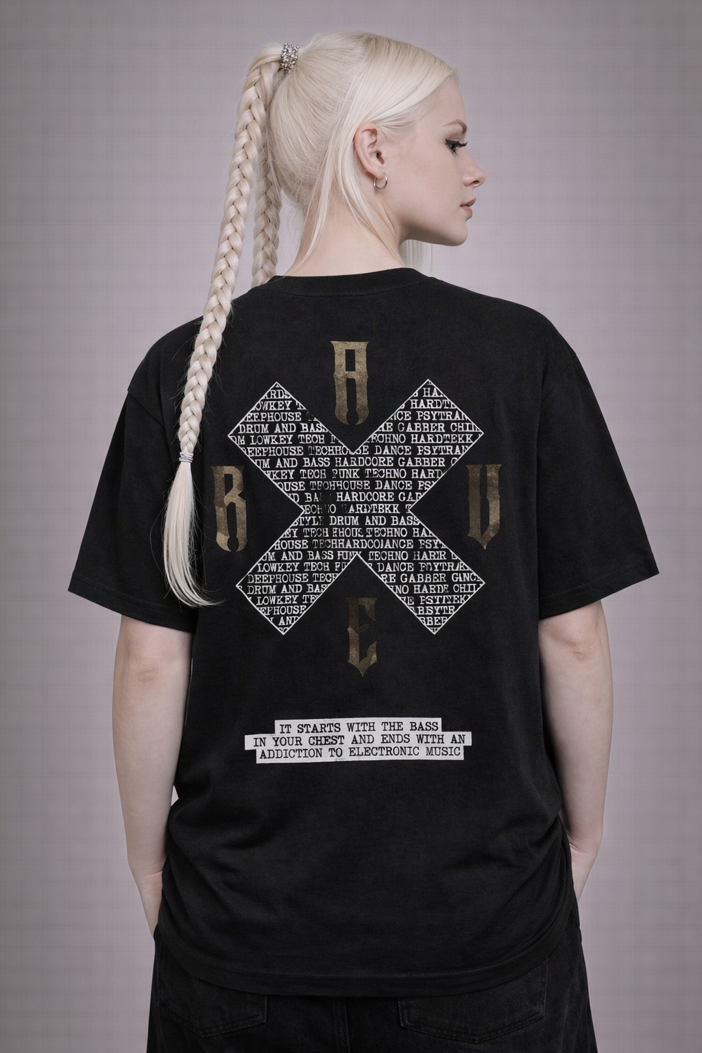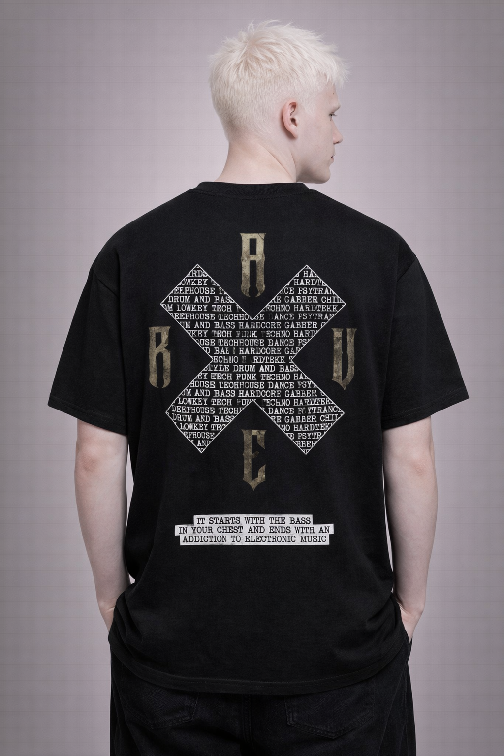Die umliegenden Buchstaben R A V E stehen wie Markierungen im Raum. Kantig, fast rituell. Kein Logo-Gefühl – eher ein Zeichen, das man trägt, wenn man weiß, warum man hier ist.